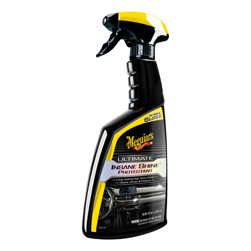 Meguiar’s Ultimate Insane Shine Protectant creates a rich, dark, and durable high gloss finish on unpainted vinyl, plastic, and rubber surfaces. This premium protectant spreads easily without streaking and creates a dark, high gloss shine that improves the appearance of surfaces like dashboards, door panels, consoles, tires, wheel wells, and exterior trim. Ultimate Insane Shine Protectant is also available in a wipe.